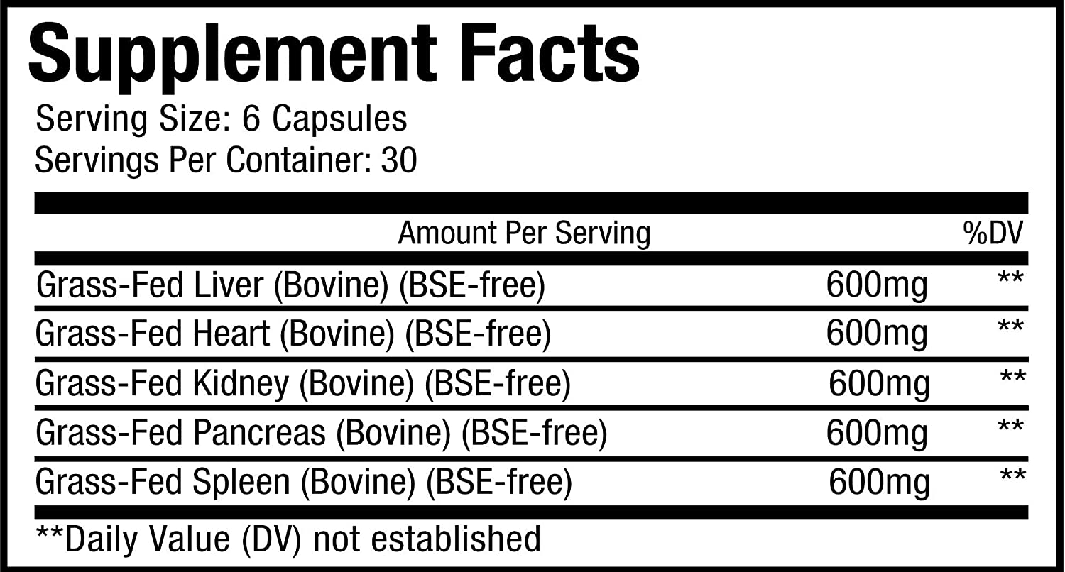 Grass-Fed Liver (Bovine) (BSE-free), Grass-Fed Heart (Bovine) (BSE-free), Grass-Fed Kidney (Bovine) (BSE-free), Grass-Fed Pancreas (Bovine) (BSE-free), Grass-Fed Spleen (Bovine) (BSE-free). Other Ingredients: Methylcellulose Capsule.