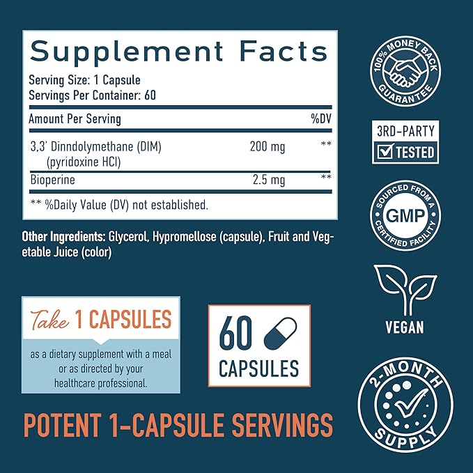 ผลิตภัณฑ์เสริมอาหาร DIM 200 มก. | สำหรับการปรับสมดุลฮอร์โมน | แคปซูลบรรจุไมโครบีดเล็ตแบบออกฤทธิ์ช้า | การปรับสมดุลเอสโตรเจน สูตรที่เหมาะสำหรับทั้งผู้หญิงและผู้ชาย | อาหารเสริมรักษาสิวฮอร์โมน, ดูแลอาการจากวัยหมดประจำเดือน และสนับสนุนสารต้านอนุมูลอิสระ | เป็นมิตรกับวีแกน, สูตรที่ปราศจากถั่วเหลือง | จำนวน 60 แคปซูล