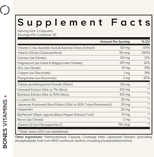 Codeage Bones Vitamins+ มีส่วนผสมของวิตามิน D3, K2, แคลเซียม, แมกนีเซียม, โบรอน, สังกะสี, แมงกานีส, เฮสเพอริดิน, หญ้าญี่ปุ่น, แอลไลซีน, ไม้ไผ่, สารสกัดจากต้นหางม้า, BioPerine® และส่วนผสมพิเศษอื่น ๆ สูตรการผสมผสานของอาหารเสริมนี้มาพร้อมกับเทคโนโลยี Helix liposomal delivery อันเป็นกรรมสิทธิ์เฉพาะของ Codeage ทีช่วยในการเพิ่มประสิทธิภาพการดูดซึมของสารอาหาร ให้ร่างกายของเราได้รับสารอาหารอย่างเต็มที่