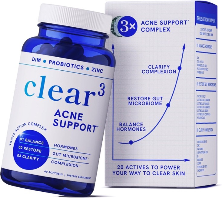 ผลิตภัณฑ์เสริมอาหารสำหรับรักษาสิว Clear3 Acne support ที่มีส่วนประกอบของสังกะสี, DIM และโปรไบโอติกส์ | สูตร 3-in-1 ที่ช่วยเสริมสร้างสมดุล, ปรับความกระจ่างใส, ฟื้นฟูความแข็งแรงของชั้นผิวหนัง ด้วยส่วนประกอบของกรดไฮยาลูโรนิกและวิตามินบำรุงผิว | สูตรที่เหมาะสำหรับทั้งผู้หญิงและผู้ชาย | ผลิตภัณฑ์เสริมอาหารสำหรับรักษาสิวฮอร์โมนแบบรับประทาน | ปริมาณ 60 แคปซูล