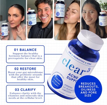 สูตรคอมเพลกซ์ที่ทำงานร่วมกันใน 3 ปัจจัยที่ครอบคลุมการรักษาสิว : สูตร Clear3 ได้รับการคิดค้นมาอย่างครอบคลุม เพื่อจัดการกับปัญหาสิวของคุณอย่างเด็ดขาด ด้วยการสนับสนุน 3 ปัจจัยที่ส่งผลต่อผิวของคุณมากที่สุด ได้แก่ ความสมดุลของฮอร์โมน, จุลินทรีย์ในลำไส้และสารอาหารที่จำเป็นต่อผิว