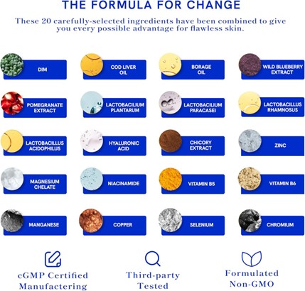 ผลิตภัณฑ์นี้พยายามทำให้ผิวของคุณดีขึ้นโดยทำให้ร่างกายของคุณแข็งแรงขึ้น มีวิตามินและโปรไบโอติกส์ จึงสามารถรักษาคุณจากภายในสู่ภายนอกได้ ทางแบรนด์ระบุส่วนผสมทั้งหมดซึ่งยอดเยี่ยมมาก ฉันชอบที่เราสามารถรู้ได้เลยว่า ร่างกายของเราได้รับอะไร