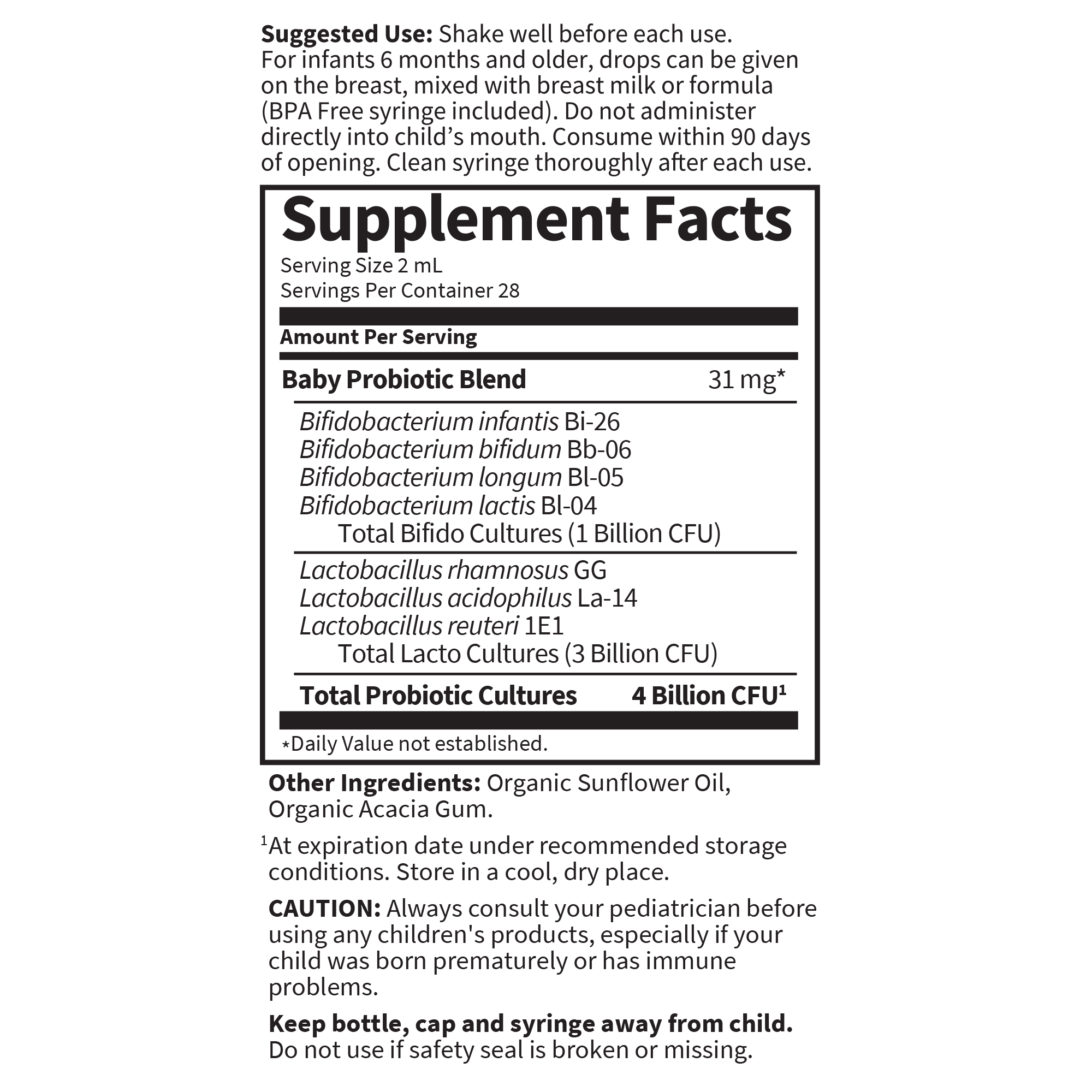 • Baby Probiotic Blend (Bifidobacterium infantis Bi-26, Bifidobacterium bifidum Bb-06, Bifidobacterium longum Bl-05, Bifidobacterium lactis Bl-04, Lactobacillus rhamnosus GG, Lactobacillus acidophilus La-14, Lactuteri Organic Sunflower1) Organic Acacia Gum.