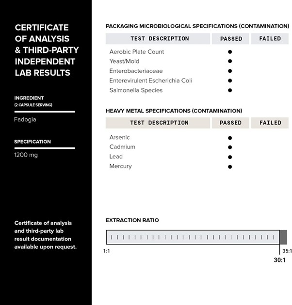 สารสกัด Fadogia agrestis ที่มีความเข้มข้น 30:1 และได้รับการรับรองและผ่านการตรวจสอบจากห้องปฏิบัติการองค์กรอิสระ :