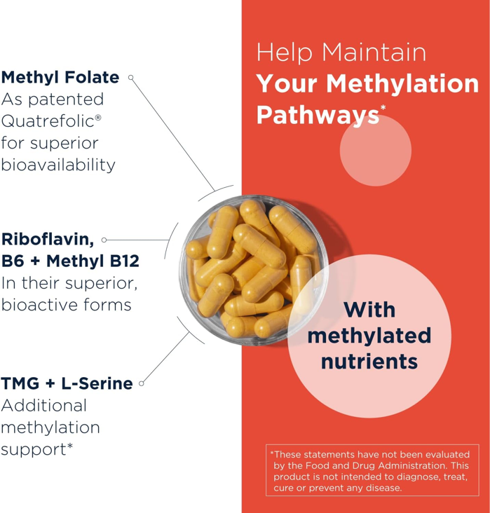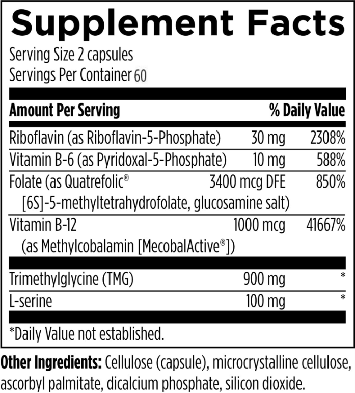 สนับสนุนสุขภาพด้วยสูตรเมทิลเลชั่น – ผลิตภัณฑ์เสริมอาหารคอมเพล็กซ์มัลติวิตามิน B รูปแบบเมทิลเลชั่น พร้อมกับแอล-เซอรีน (L-serine) และ TMG (ไตรเมทิลไกลซีน) ซึ่งเป็นสารที่ทราบกันดีว่า ช่วยอำนวยความสะดวกในการเผาผลาญโฮโมซิสเทอีนและกระบวนการเมทิลเลชั่นตามปกติให้เป็นไป อย่างมีประสิทธิภาพ*