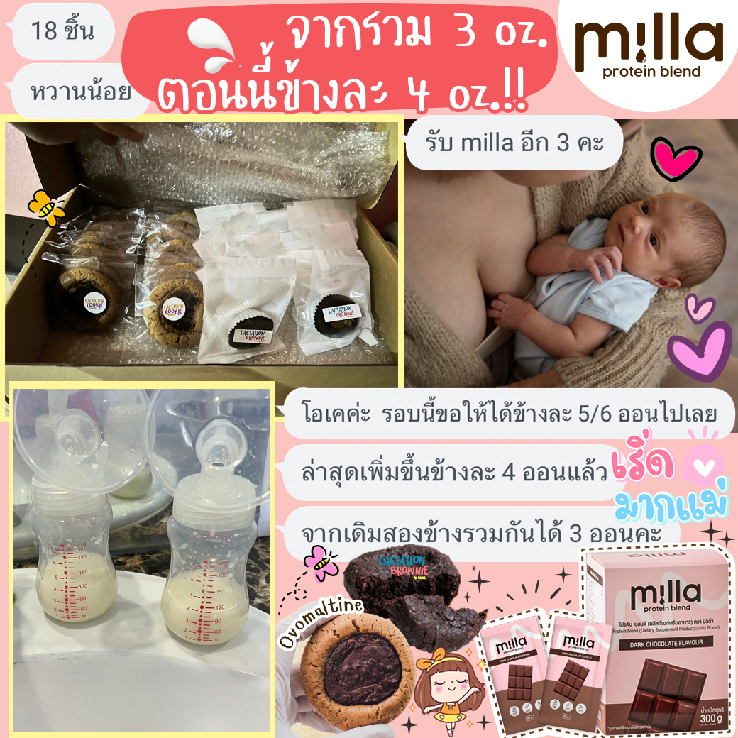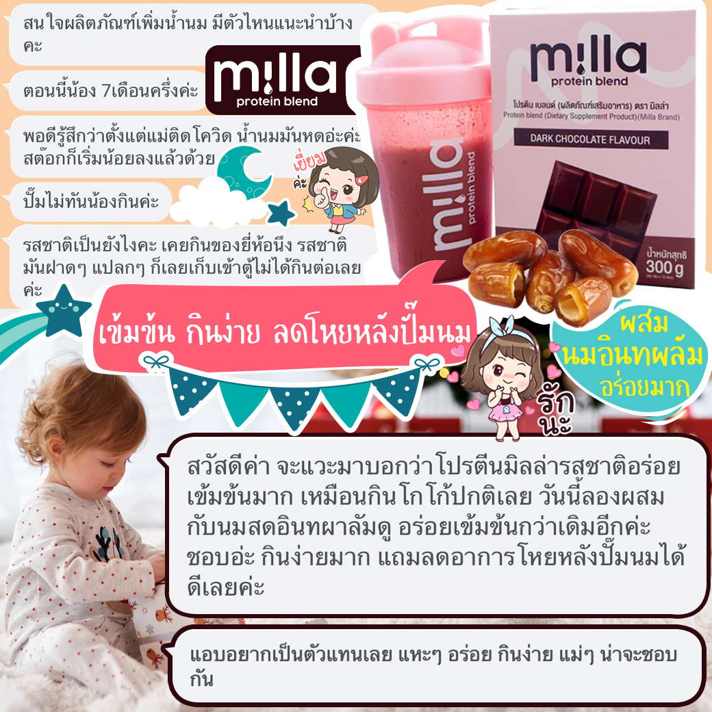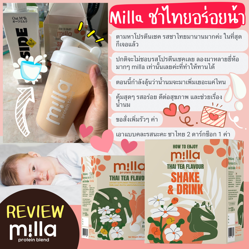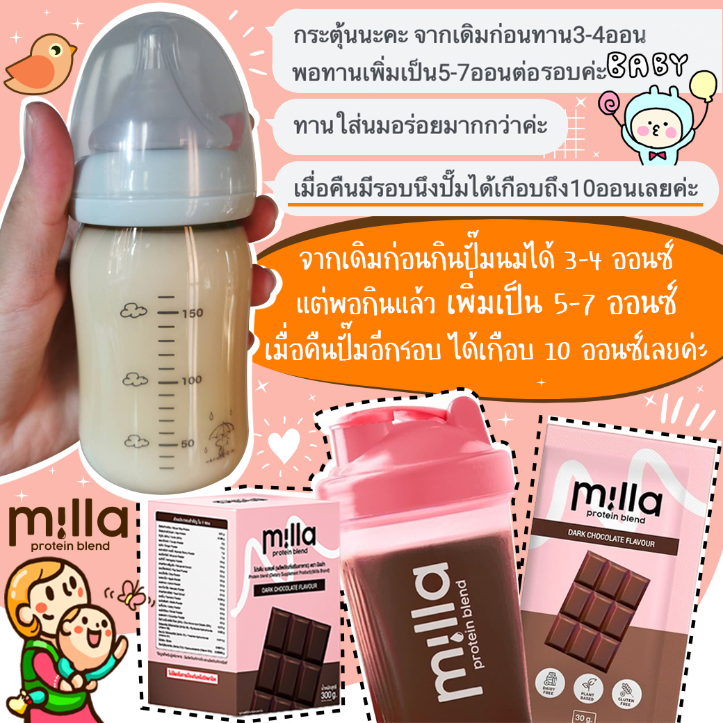 Milla Protein Blend โปรตีนสำหรับแม่ให้นมในสูตรที่ครบที่สุด ผลิตภัณฑ์ที่ทำมาเพื่อการแก้ปัญหาวงจรการเสพติดน้ำตาลและแป้งของคุณแม่ คุณจึงต้องการโปรตีนและสารอาหารที่เพียงพอในทุกๆมื้อเพื่อการลดน้ำหนักที่ดีและยังคงปริมาณน้ำนมไว้ให้เพียงพอกับการเลี้ยงดูทารกน้อย Milla คำนึงถึงความสะดวกในการใช้ชีวิตและการเตรียมสารอาหารสำหรับคุณแม่ จึงมีส่วนประกอบของโปรตีนเป็นสารอาหารหลักเพื่อให้คุณอิ่มท้องยาวนานลดการเกิดอาการอยากของหวานที่มักทำให้ได้รับแคลอรี่เกินความต้องการ มีวิตามิน แร่ธาตุ อีกทั้งยังมีสารสกัดจากสมุนไพรที่ดีต่อการเพิ่มปริมาณน้ำนมของคุณแม่มาอย่างครบถ้วน อีกทั้งยังมีรสชาติดีดื่มง่าย ให้คุณแม่ได้อารมณ์ดีในทุกวัน
